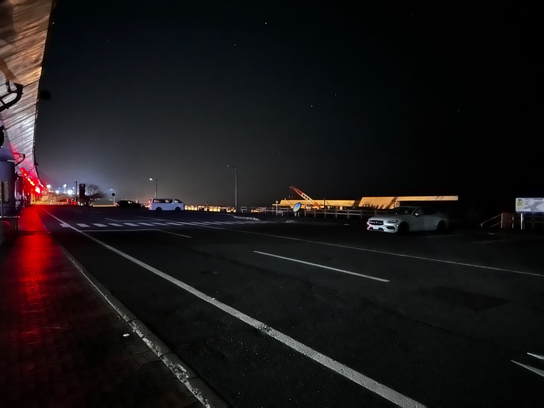 夜は街灯も点かず真っ暗でした。朝になると漁船が海で漁をしていました。左側のライトは漁船のライトです。