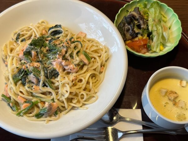 今日のご満悦おばさんは、サーモンとほうれん草のポルチーニクリームパスタセット(パスタ・ミニサラダ・コーンポタージュ)1,320円です。ボリュームがあるだけでなく、サーモンとほうれん草もたっぷり入っているとご満悦のご様子でした。