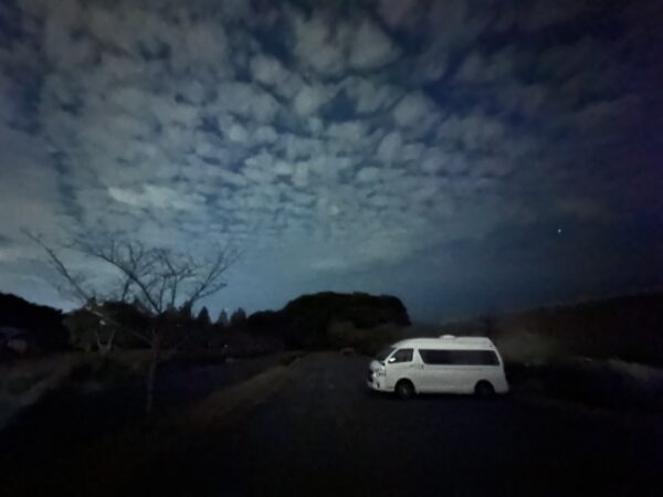 このように真っ暗になります。奥に黒い車が駐まっていましたが、いなくなって僕たちだけになりました。しかし、静かでいいところと言った感じで(僕らにとって)怖いという感じはまったくしないところでした。