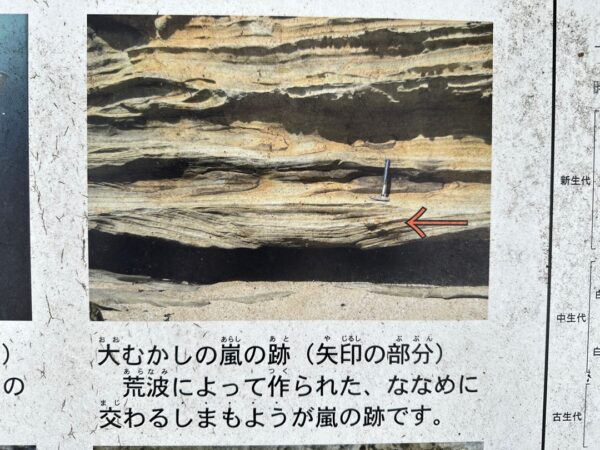 斜めになっている地層の一部が乱れているところがありますが、これがストーム堆積と言われる部分だと思います。嵐で海底の地層が乱れて再堆積した部分になります。