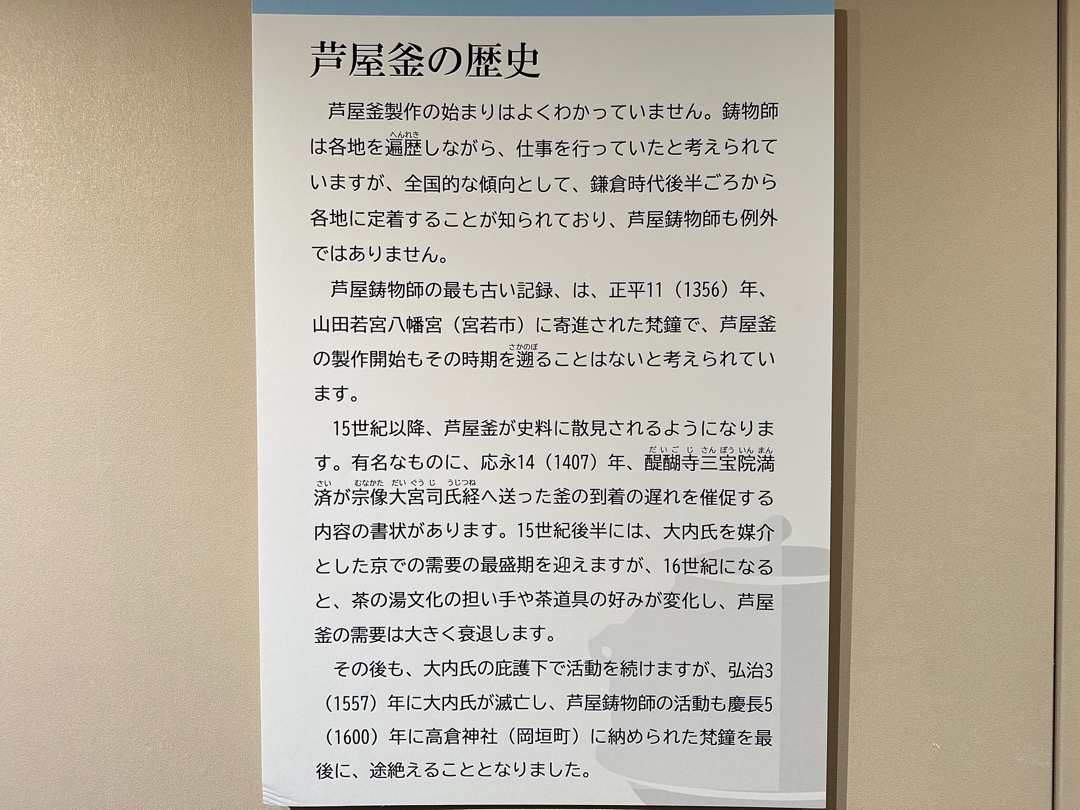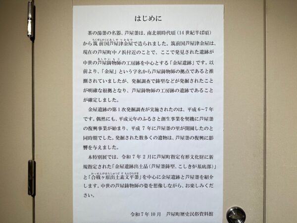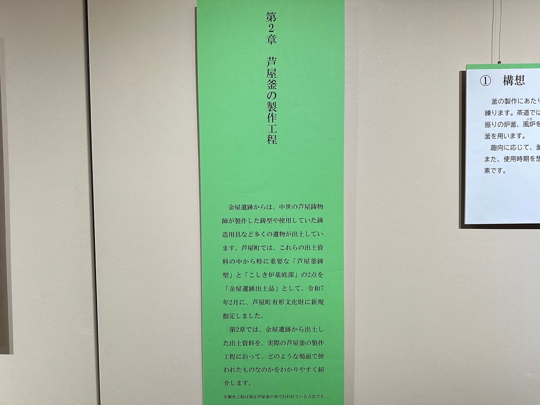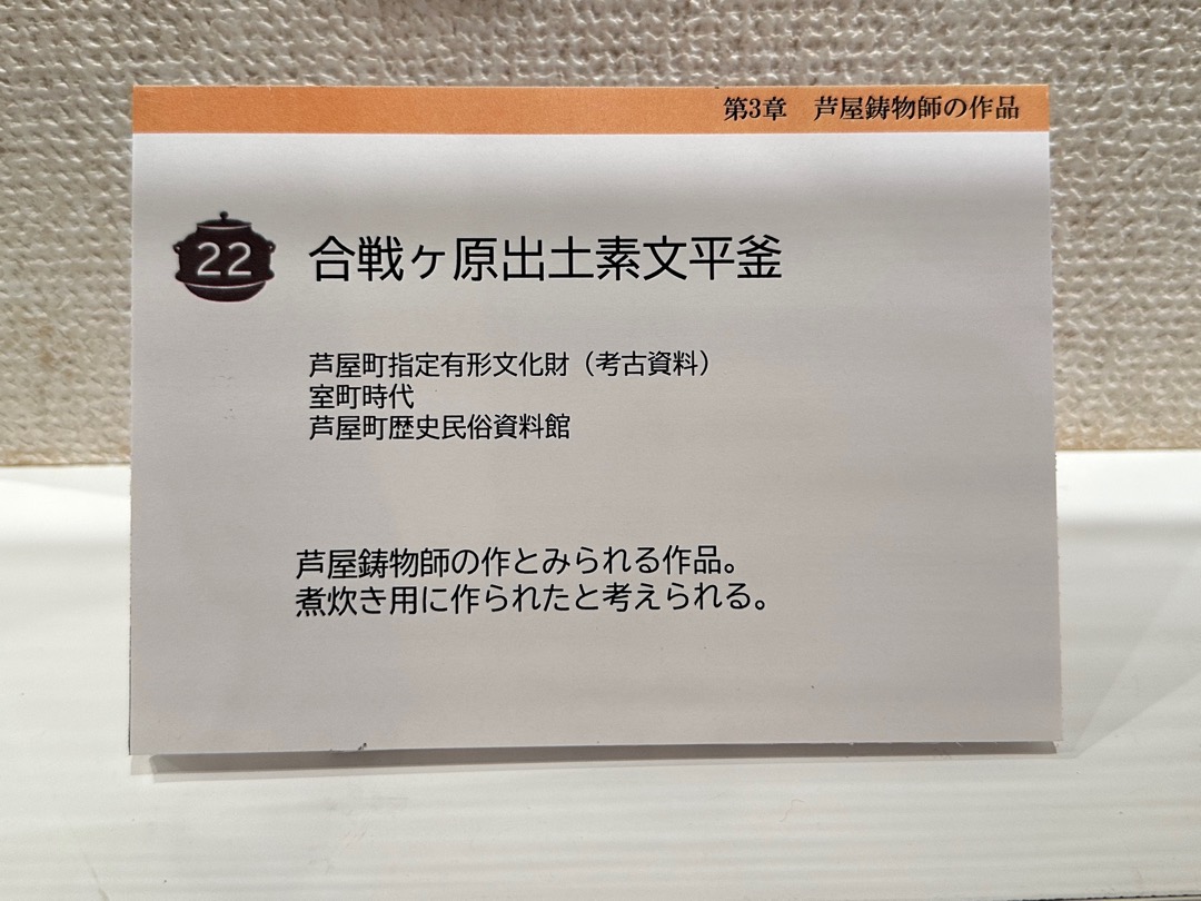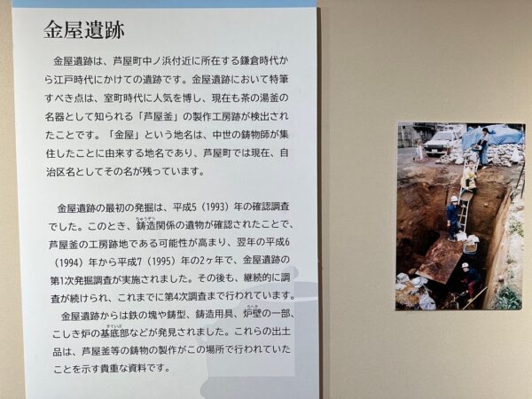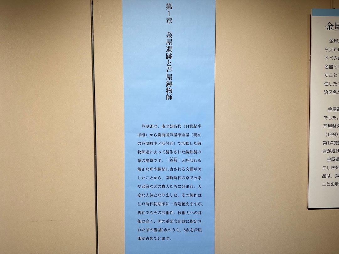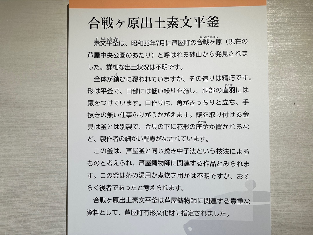 縄文時代から弥生時代までの遺跡、室町時代に茶の湯釜として一世風靡した芦屋釜の鋳型や炉などが見つかった金屋遺跡などの展示がされていました。
