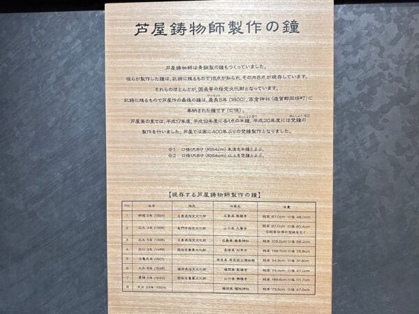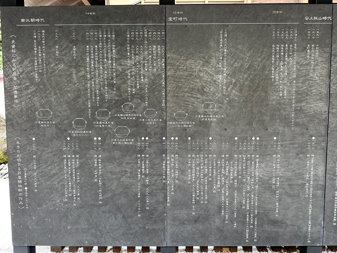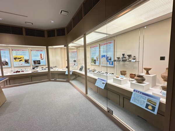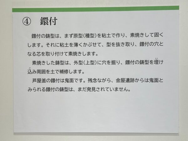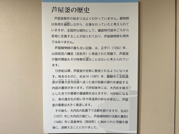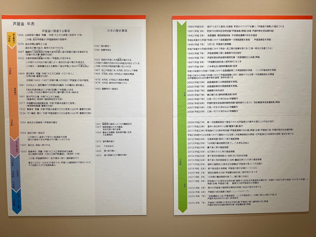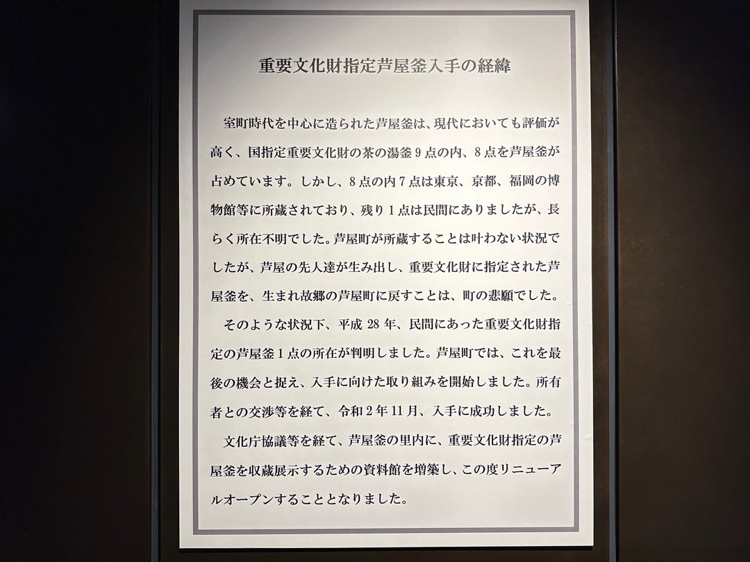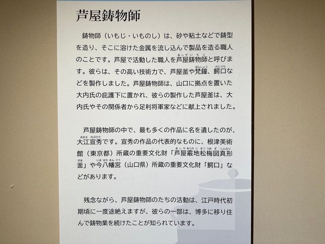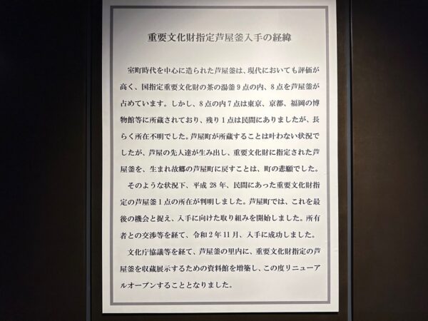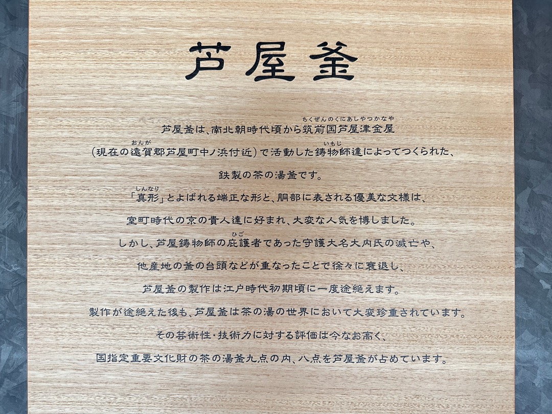 縄文時代から弥生時代までの遺跡、室町時代に茶の湯釜として一世風靡した芦屋釜の鋳型や炉などが見つかった金屋遺跡などの展示がされていました。