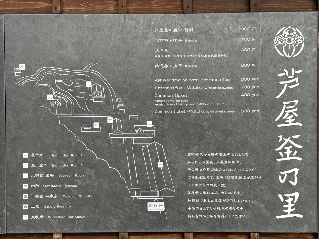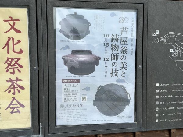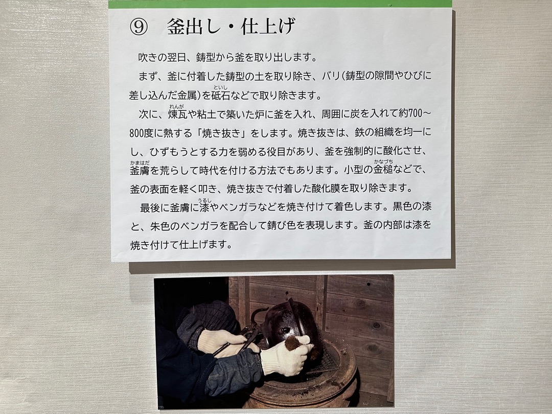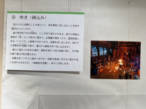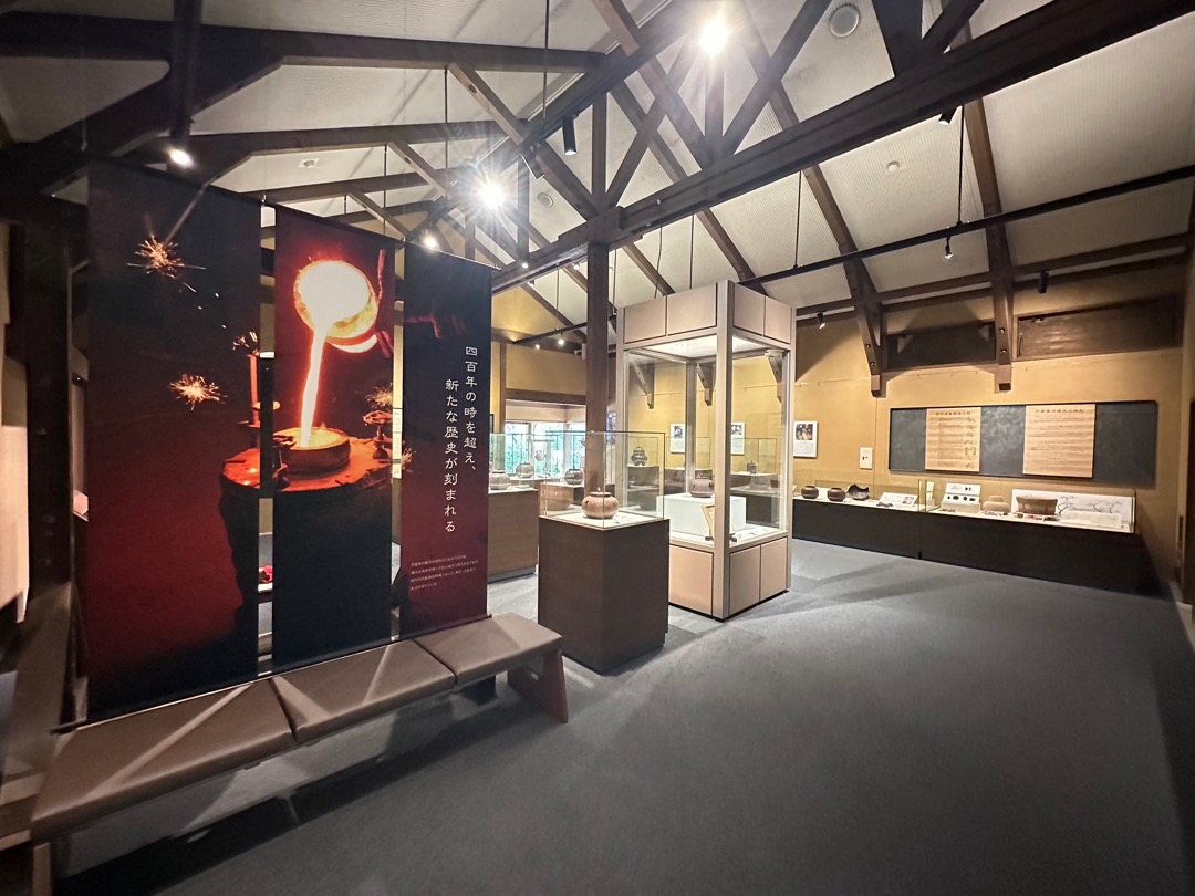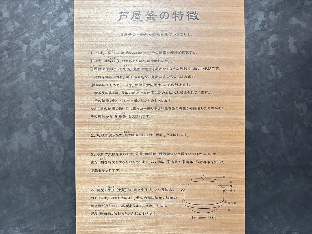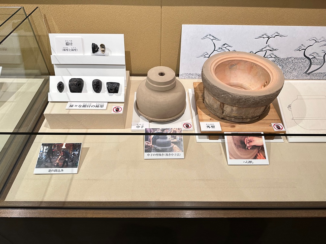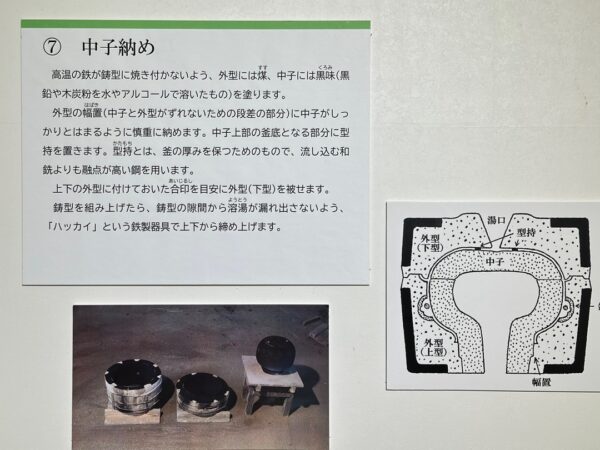 日本には、国の重要文化財に指定されている茶釜が9点あり、そのうちの8点がここ芦屋の茶釜なのだそうです。今回、ここで説明のビデオ約10分と展示品を観て茶釜の製造方法をよく理解することができました。
