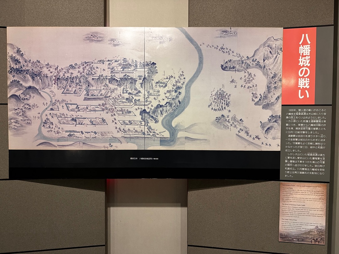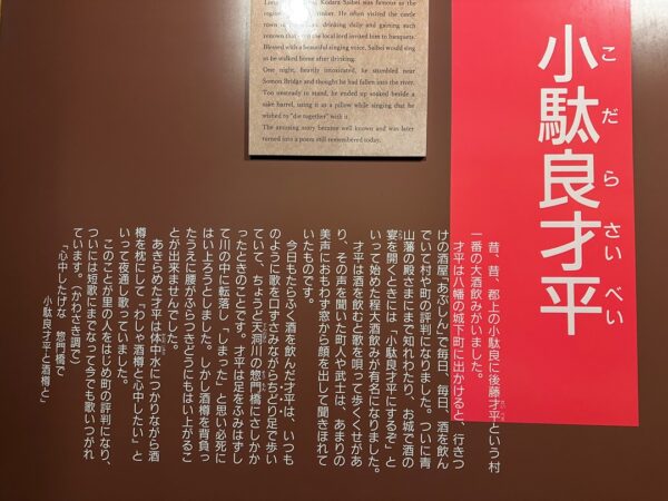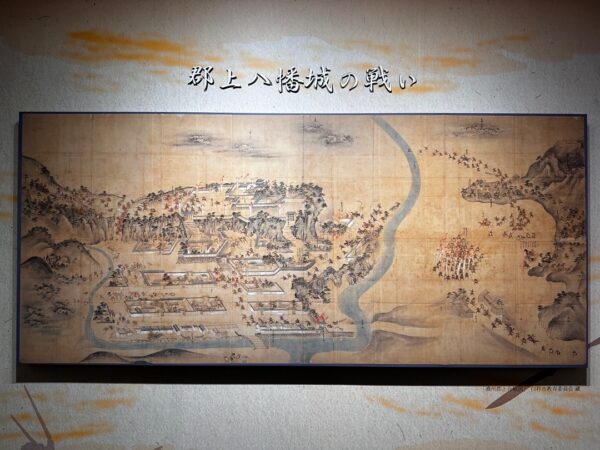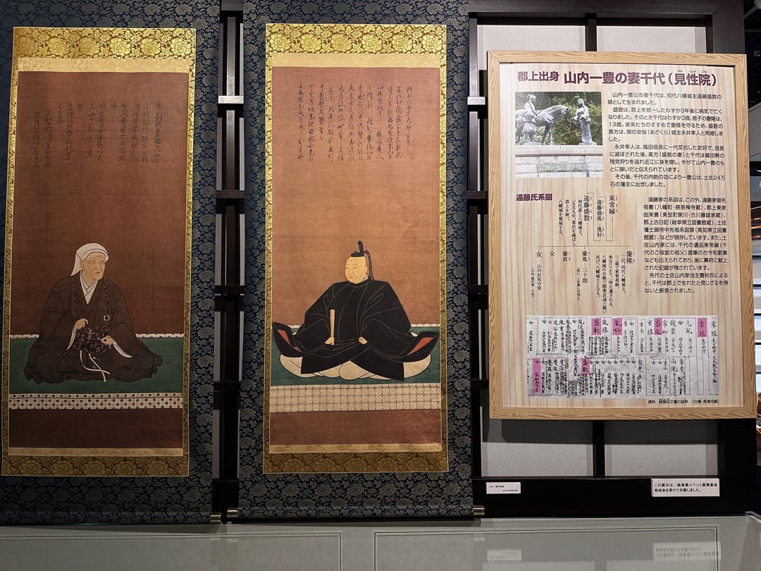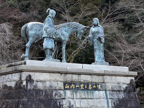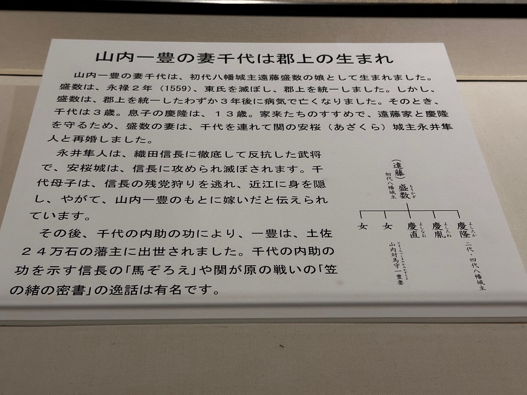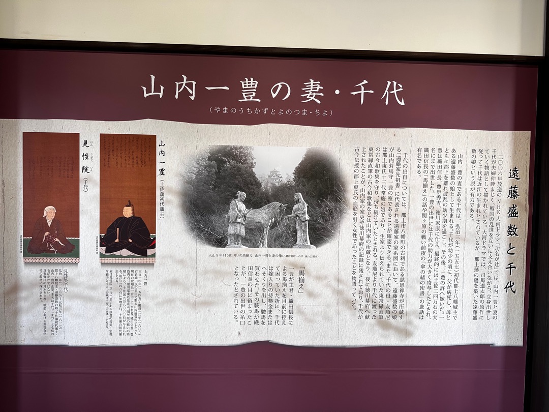 駐車場の脇に山内一豊とその妻(千代)の像がありました。千代の出自に関しては、長宗我部元親の娘という説や、司馬遼太郎の功名が辻では土佐出身の女性などいろいろな説があります。ここ郡上市では、郡上八幡城の始祖である遠藤盛数の娘という説を推しており、いろいろなところで、それを裏付ける史料が展示されていました。