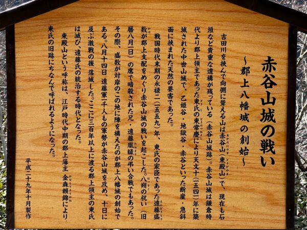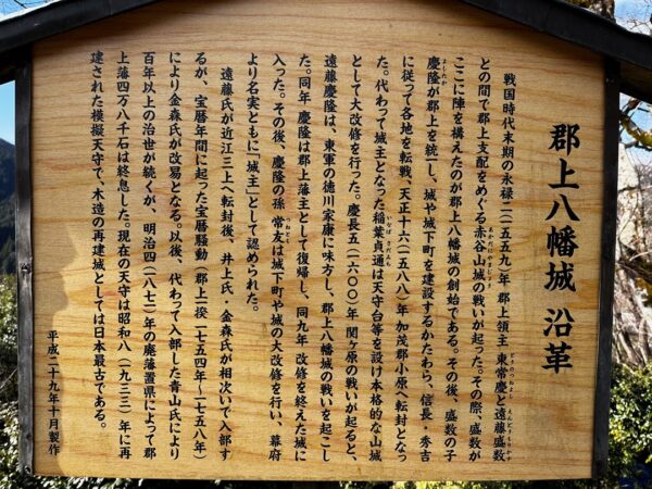 遠藤盛数が郡上八幡城の創始者であり、その後、遠藤→稲葉→遠藤→井上→金森→青山と次々と城主が変わります。天守台を設けたのは稲葉貞通だそうです。