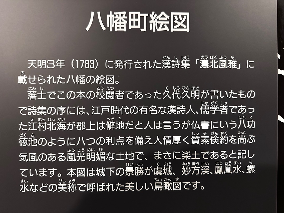 ここにあった資料によりますと八幡の地名のおこりは13世紀の武蔵権守、鷲見頼保(すみよりやす)の鷲退治の伝説から生まれたと言うところまでわかりました。Wikipediaによりますと「鷲狩り伝説時に頼保が、長良川で「八幡」の文字が浮かび上がる鷲の羽根を発見し、村人にそれを神体として祀るよう伝えたのが由緒と伝わる」らしいです。そんな鷲は、さすがのしげちゃん先生も知らないと思いますが…。
