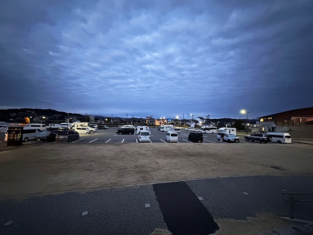 道の駅の朝です。車中泊した車は、ざっと数えて70台くらいいました。ギャブコンも多かったです。能登半島にいる時には見かけなかったのですが、どこから出てきたのだろうと思うくらいいました。