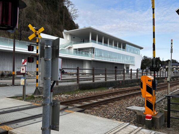 海沿いの道路にそって建物が建っています。24時間トイレはこの建物の中央にあります。この道の駅から道路と線路を渡ったところに、