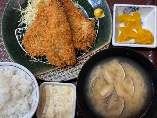 アジフライが3枚だったのですが、半身なんですよね。すべてに尻尾が付いているということは、尻尾の付いてない方の半身はどこに行ってしまうんだろうと気になりながらいただきました。フライは、サクサクしてはいたものの油っぽくて苦手なフライでした。