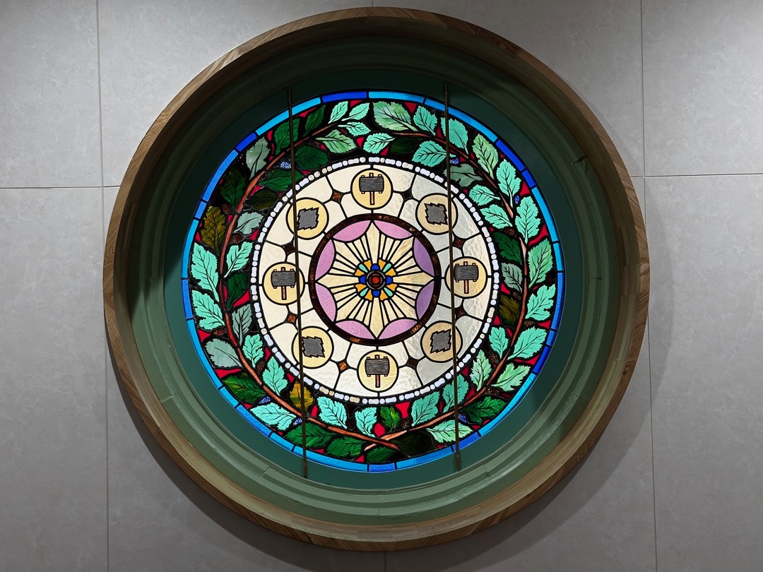 日本初のステンドグラス作家である小川三知(1867〜1928年)の作品のレプリカが階段の踊り場に展示してありました。オリジナルは作品保護のため非公開だそうです。
