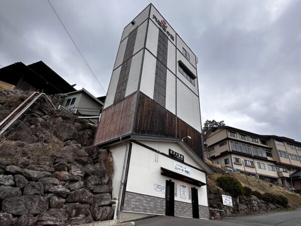 ここからエレベーターで上に上がっていく温泉です。入浴料は、750円(JAF700円)です。