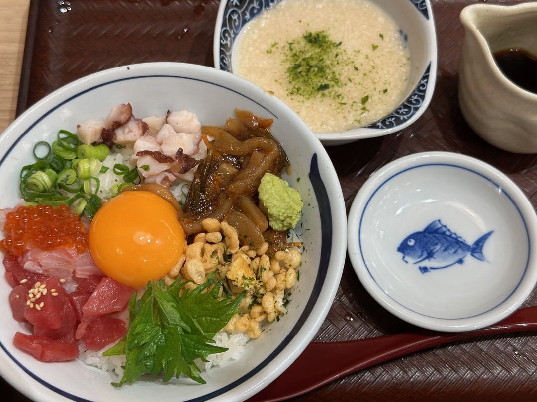 今日のご満悦おばさんは、旨味源ちゃん丼1,045円、トッピング だし割りとろろ176円 計1,221円です。納豆だと思ったものが天かすで、他のネタもしょぼいと思われたようですが、トッピングで注文されただし割りとろろをかけると、これがまた美味しさが倍増したといたくご満悦のご様子でした。