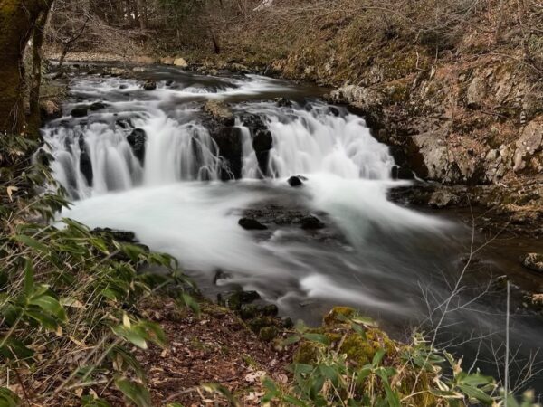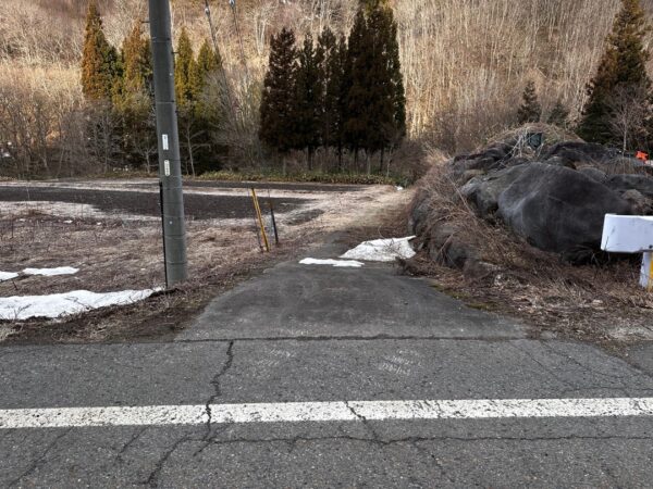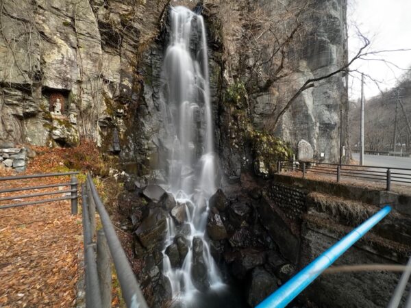 道路を渡り、この道を100mくらい歩いていくと滝が見えます。