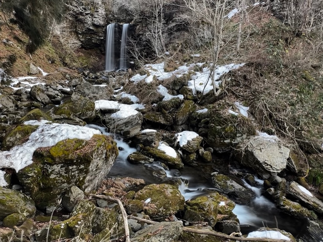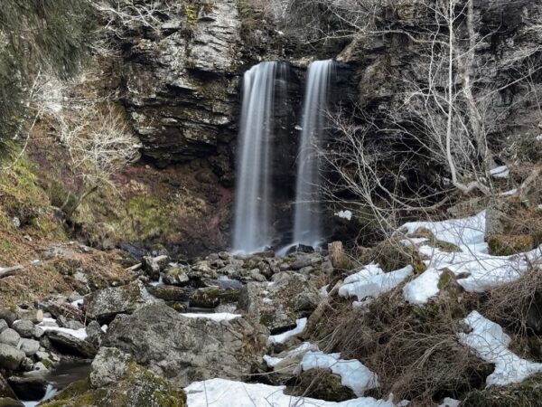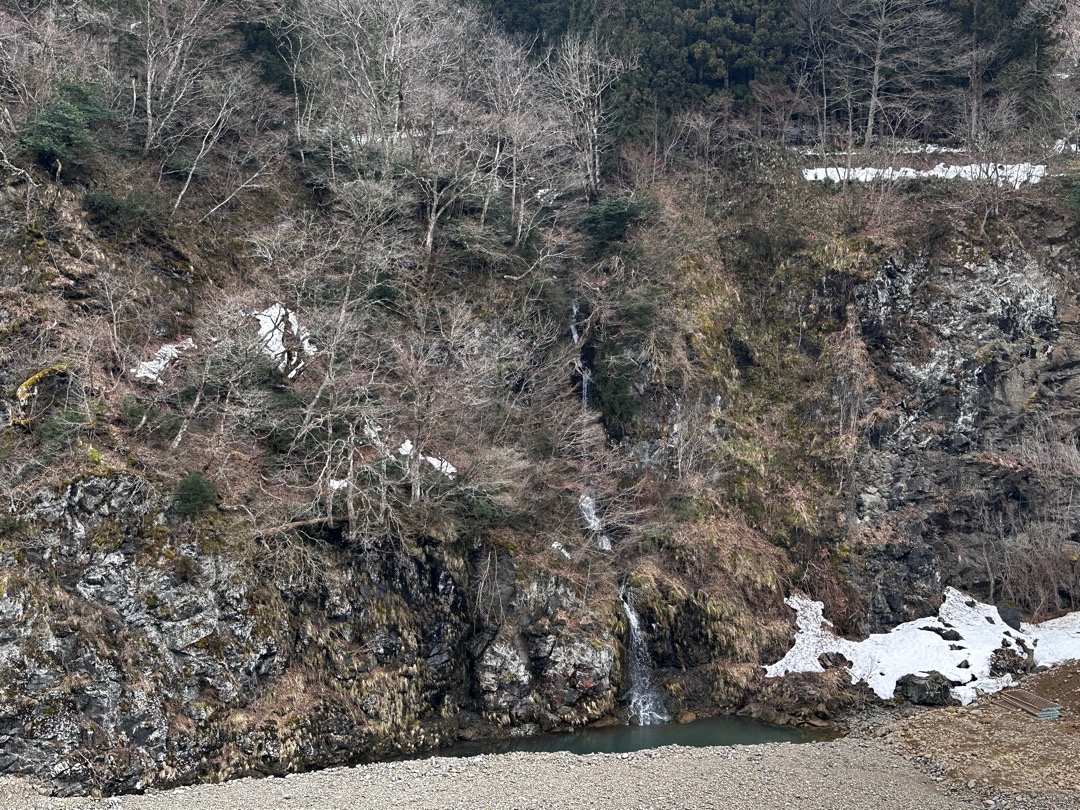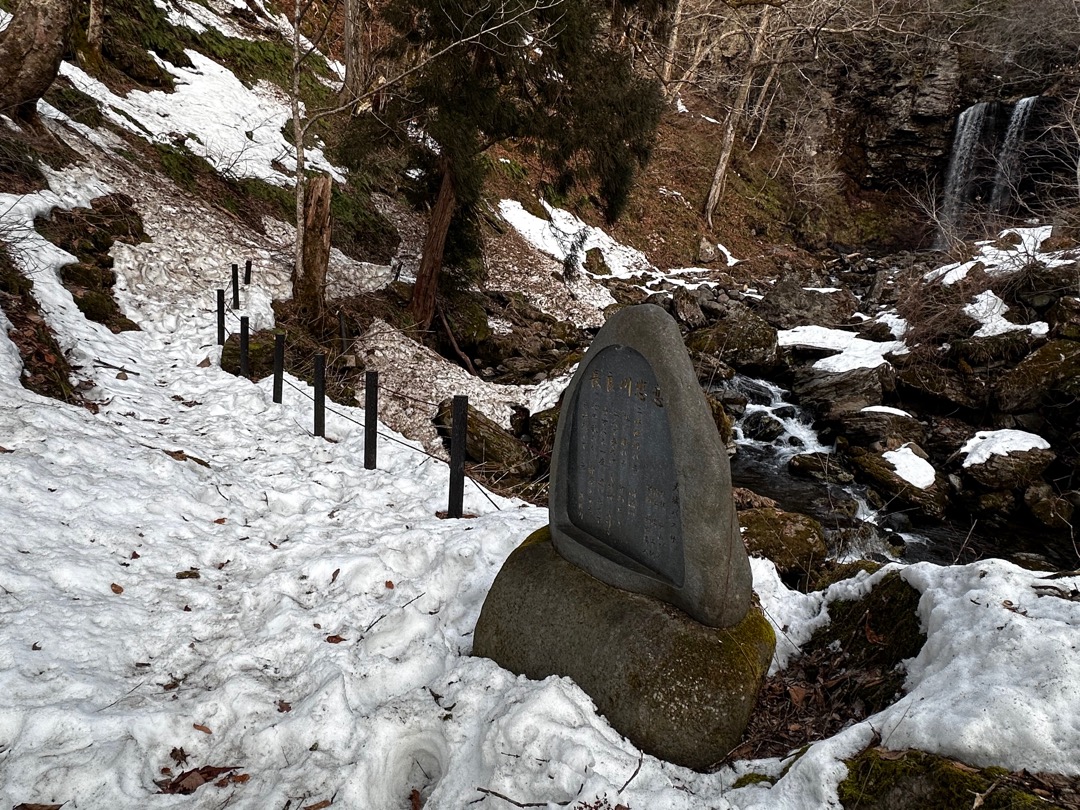 雪がなければもう少し近くまで行くことが出来たかもしれません。遠くに2本の滝が見えました。