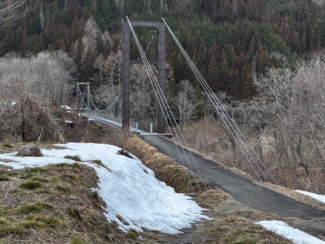 しっかり出来ていて、ほとんど揺れず、足の下も網ではなく鉄板のまったくスリルのない吊橋です。