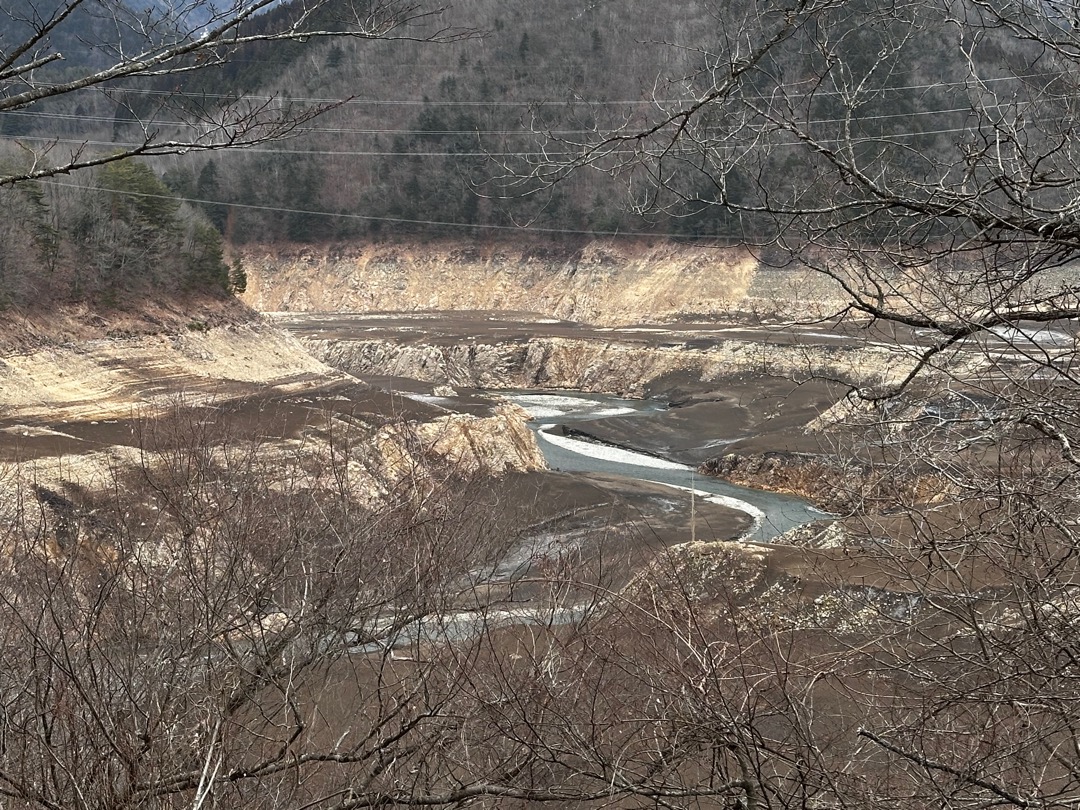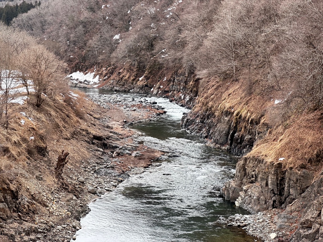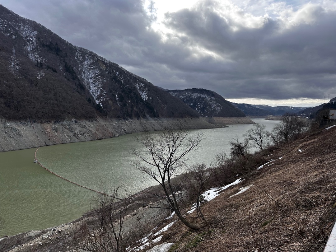 そう思いながら先へ進むとダム湖の水量が減っているためか、グランドキャニオンみたいな景色が広がっていました。車を駐めることができなかったので、その場所を少し通り過ぎてから写真を撮りました。どこがグランドキャニオンだと言われそうですが、もう少し上流だといい感じだったのです。