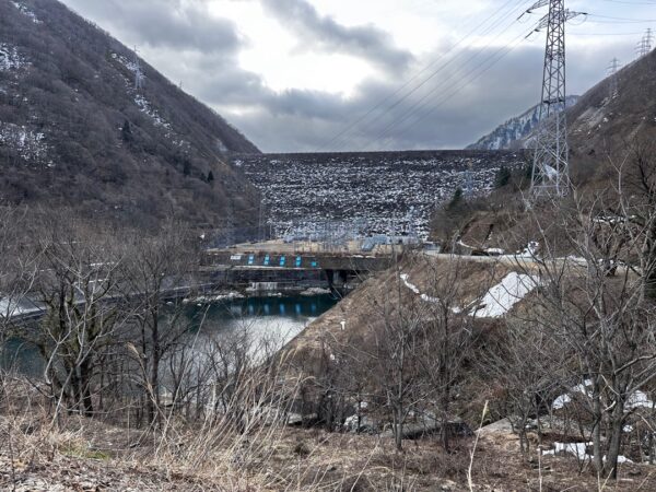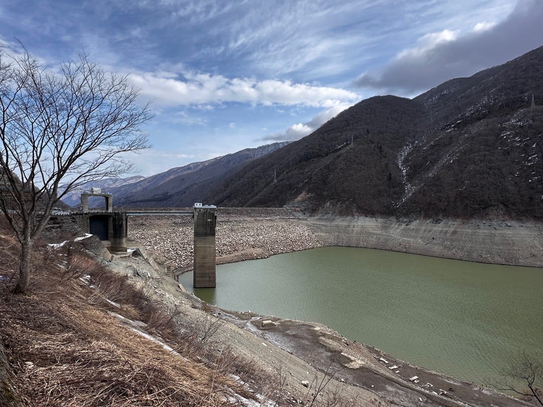 堤高 131.0m、堤頂長 405.0mの傾斜土質遮水壁型ロックフィルダムです。それにしても水位が低いですね。