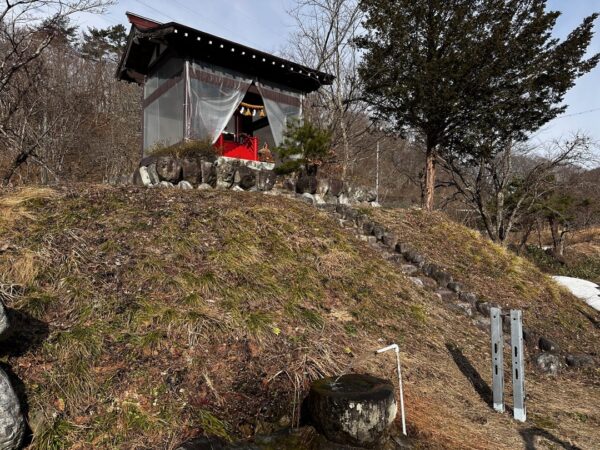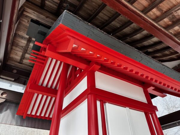 参拝した後、覗いてみるとこけら葺きの神明造りでした。とても大事にされているのがわかります。