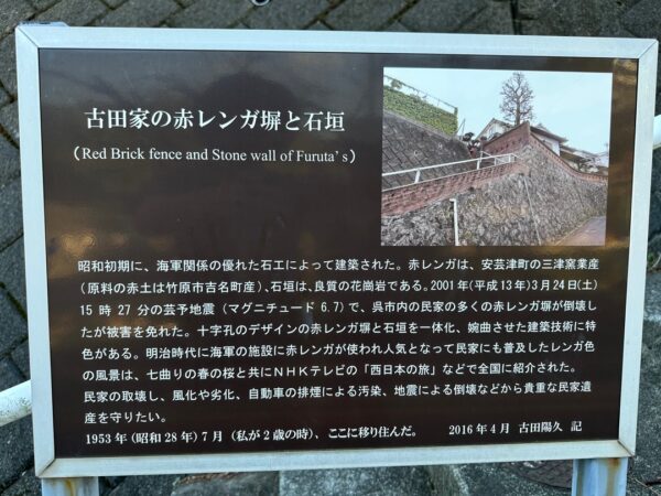 来た道を戻るつもりが、少し間違ってしまいました。しかし、そのおかげで先ほどのお寺にあるレンガ積みの塀と同じ塀があり、説明がついていました。