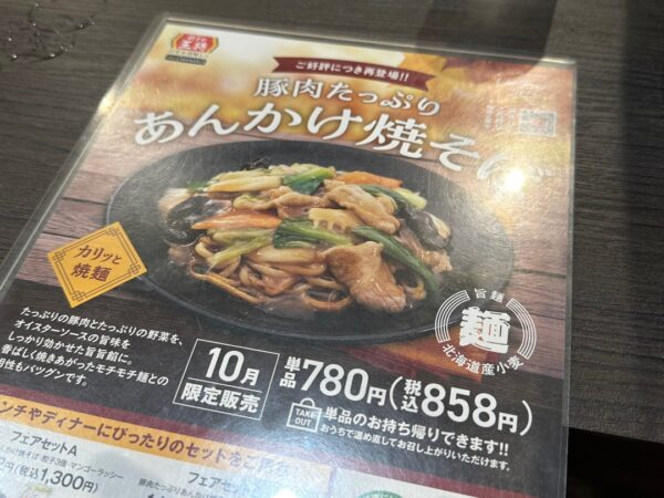 期間限定のメニューとのことで、豚肉たっぷりあんかけ焼きそば858円をいただきました。