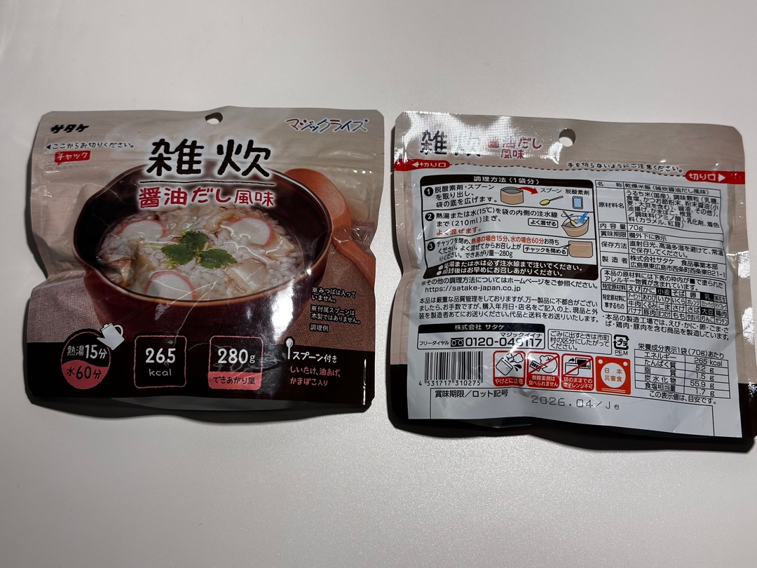 今朝の朝食です。家にストックしている非常食で賞味期限が近くなったものを旅の最中にいただくことにしています。今回のこの雑炊は、想像していたより量が多く朝ごはんにはちょうどよかったです。味も薄味でご満悦おばさんもご満悦になられていました。