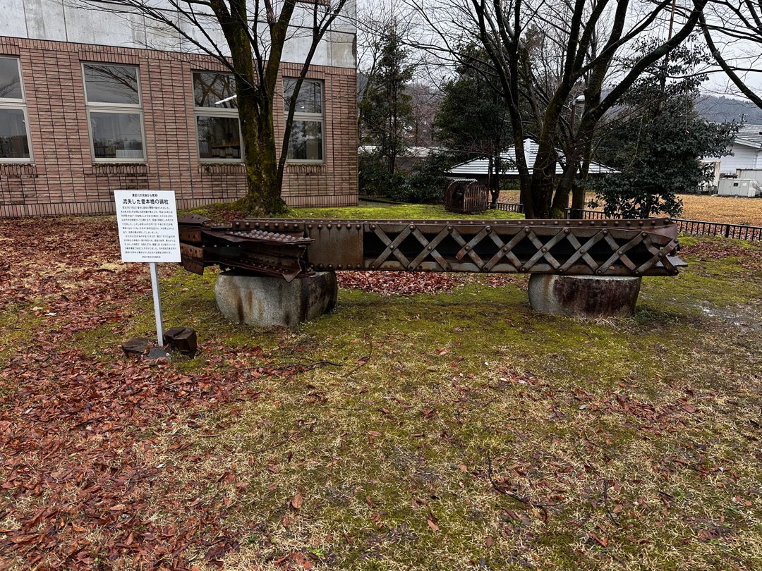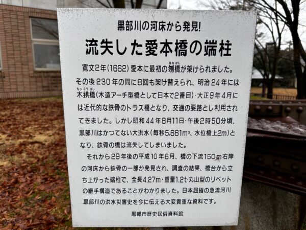流失した愛本橋の柱が資料館の表に展示されていました。