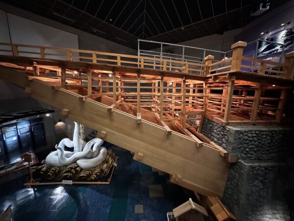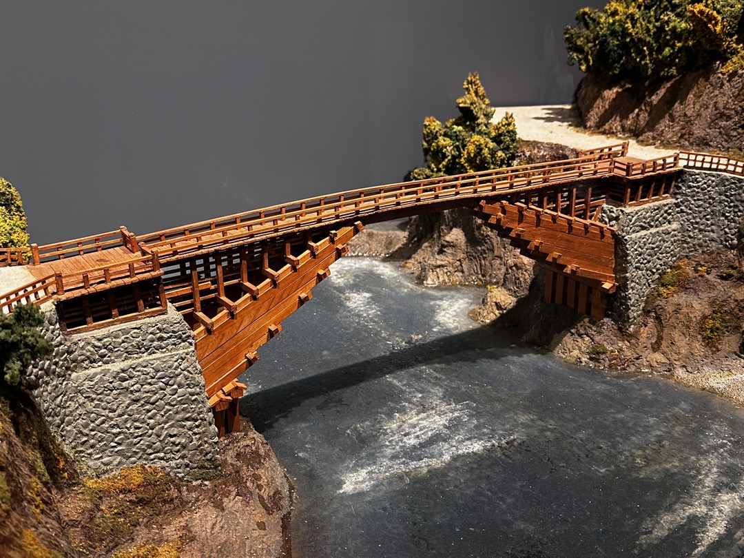 こちらは、小型の全体模型です。実物は全長63mあったそうです。橋脚がなく吊橋でもない木製の橋としてはかなり大きな橋だと思います。