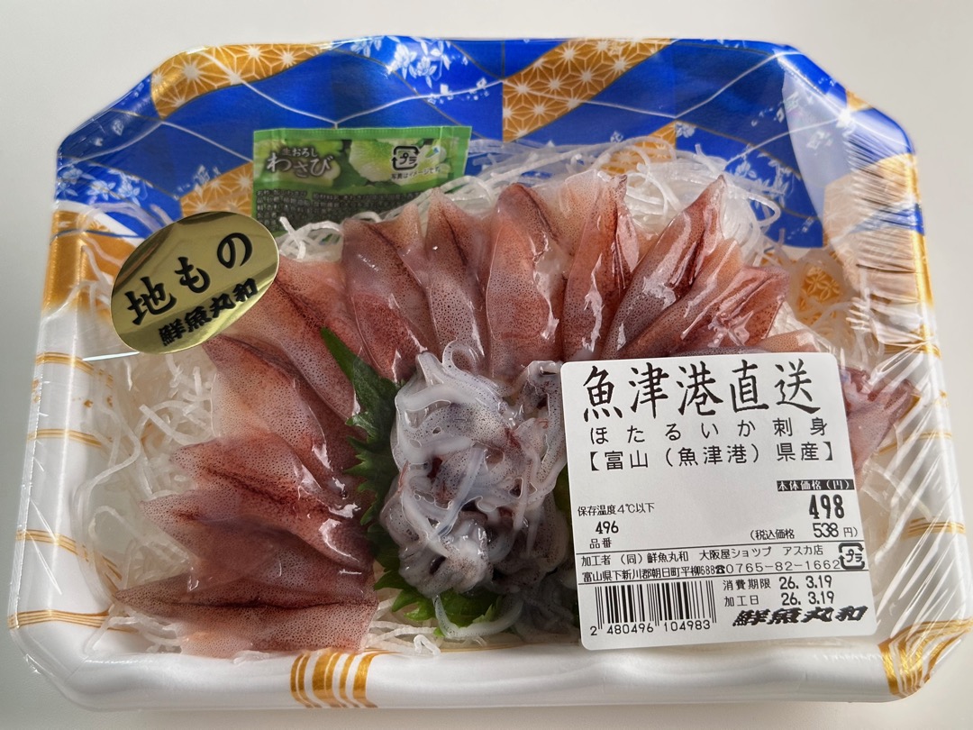ホタルイカの刺し身を買いました。茹でたホタルイカの方が美味しいのだろうと思いましたが、めったに食べられるものではないことと、こちらで食べるホタルイカの刺し身は美味しいかもしれないと思ったので買いました。