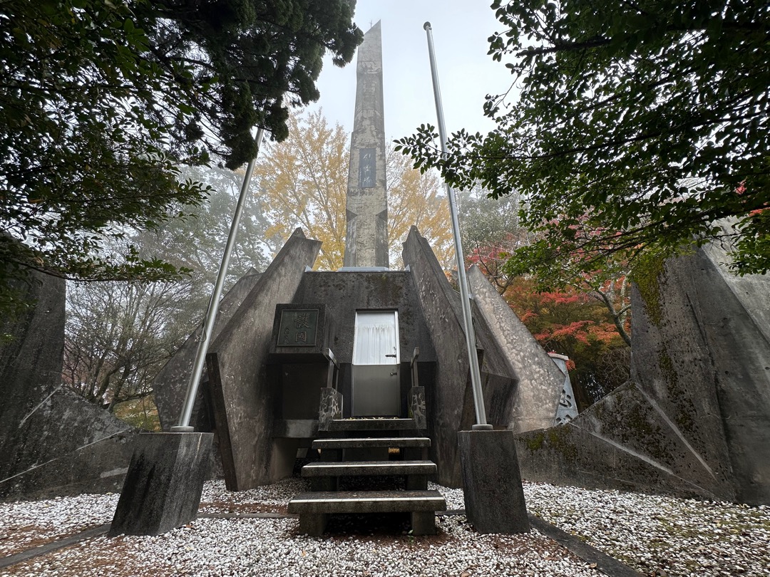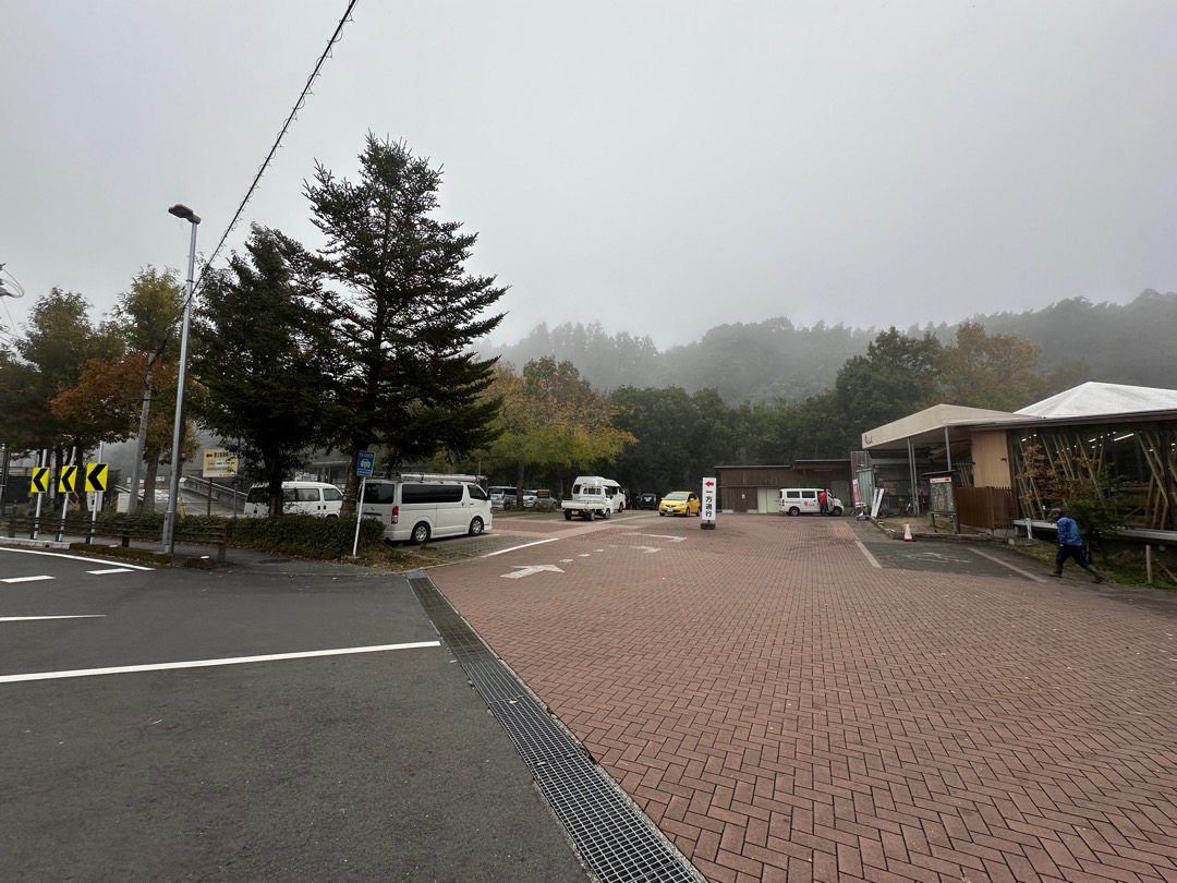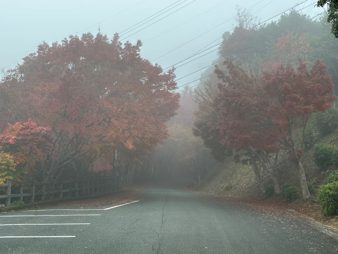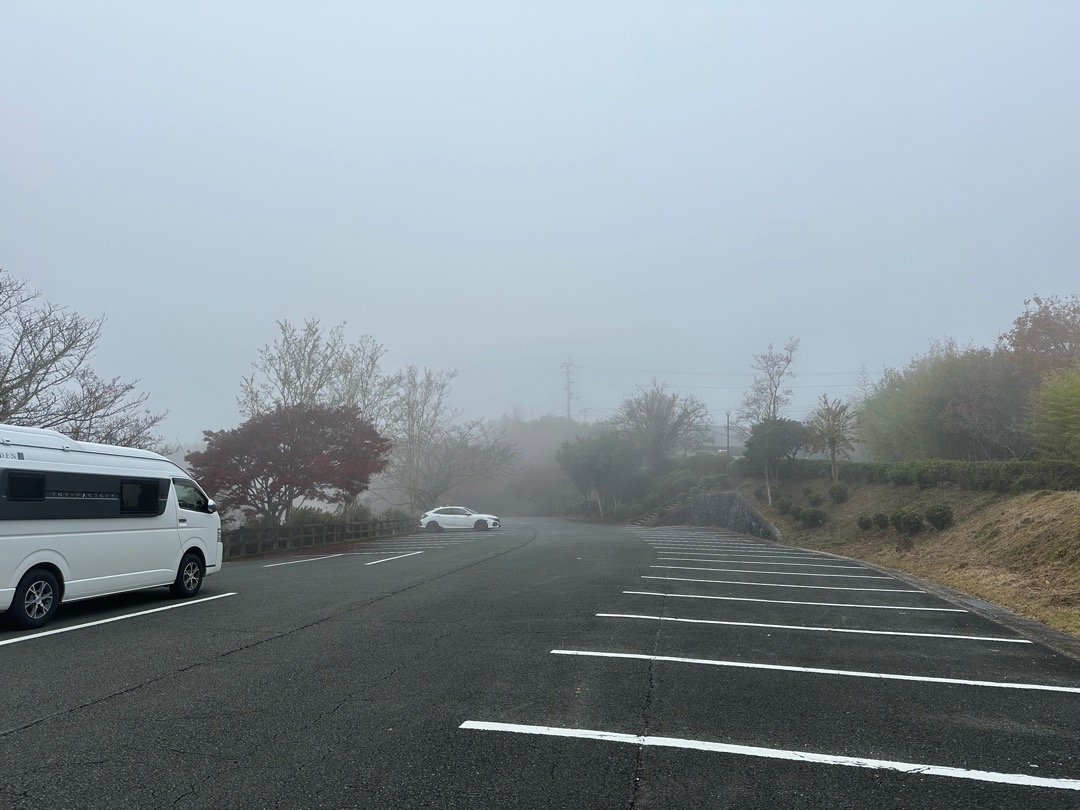 助手の事前調査によれば、駐車場から少し下ったところにあるらしいです。ただし、僕らが駐めた駐車場のことなのかどうかがわかりませんでした。しかも霧はまだ晴れず、先が見えません。