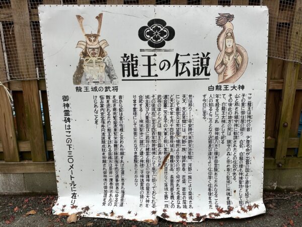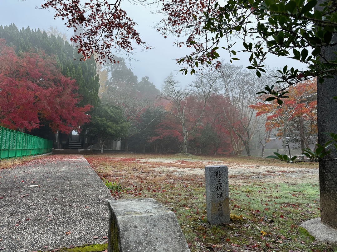 石段を登ると鳥居の横に龍王城(床崎城)と書いてあります。先ほどの説明には河野一族により築城された城と書いてありました。遺構は残ってなさそうです。